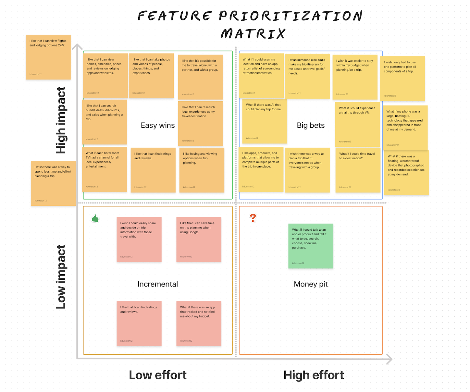 I came up with a few responses for each category, "I Like" "I Wish" "What if" and then organized this brainstorm using the Feature Prioritization Matrix, to group and categorize the ideas leading up to the design phase. I put each imagined response into its respective section: